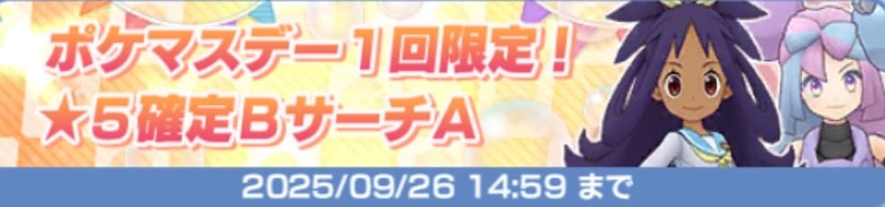 『ポケマスデー1回限定!★5確定BサーチA』はポケマスデー限定(毎月25日~26日14:59)で開催される特別なガチャです。