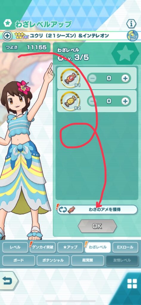(『バディーズ』→『強化』→『わざレベル』→『わざのアメを獲得』)