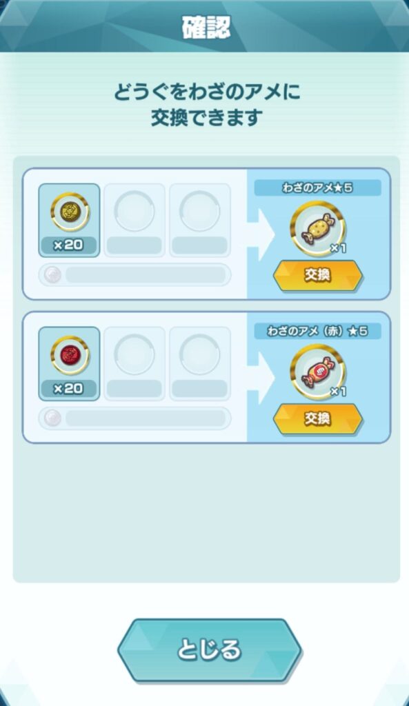 各色の『わざのアメ★5』は、対応する『わざのアメのメダル』を20個と引換えに入手できます。