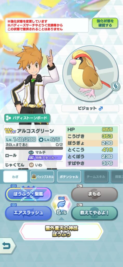 アルコスグリーン&ピジョットは、相手全員を対象とする火力シンクロ技【ぼうふう・聖嵐】と相手1体を対象とする高火力シンクロ技【エアスラッシュ・天刃】を使い分けられる、マルチバディーズ。