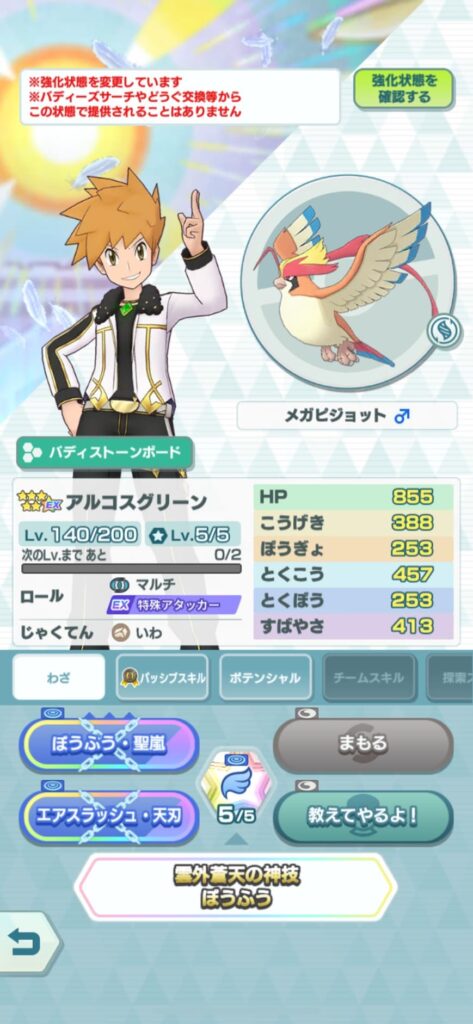 (※【バディーズわざ】を使用すると、メガピジョットへとメガシンカし、シンクロ技【エアスラッシュ・天刃】が解禁されます。)