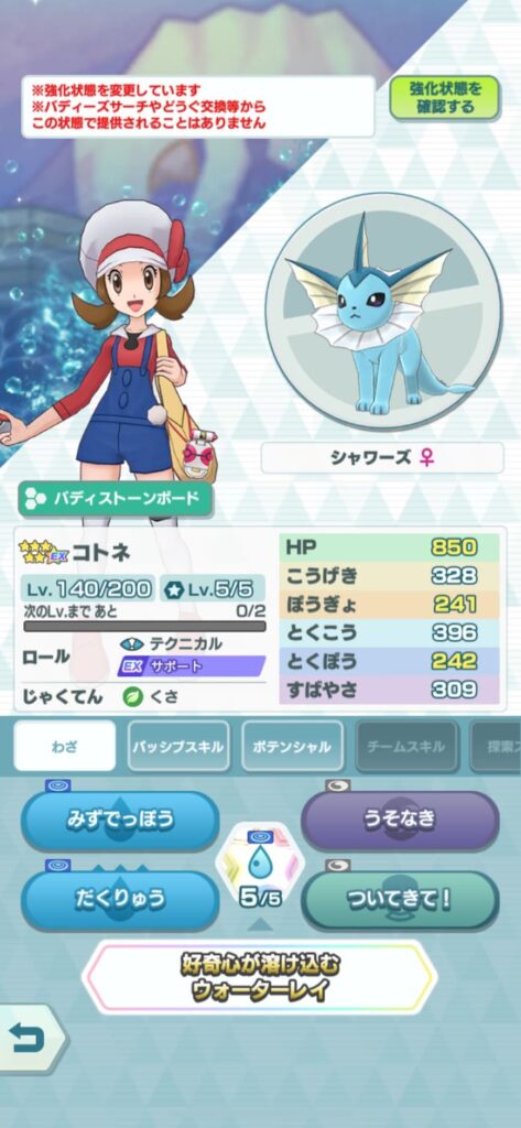 コトネ&シャワーズは、パッシブスキル【B技後雨化】の効果で【バディーズわざ】をつかったあとに天気をあめ状態にできる、テクニカルバディーズ。