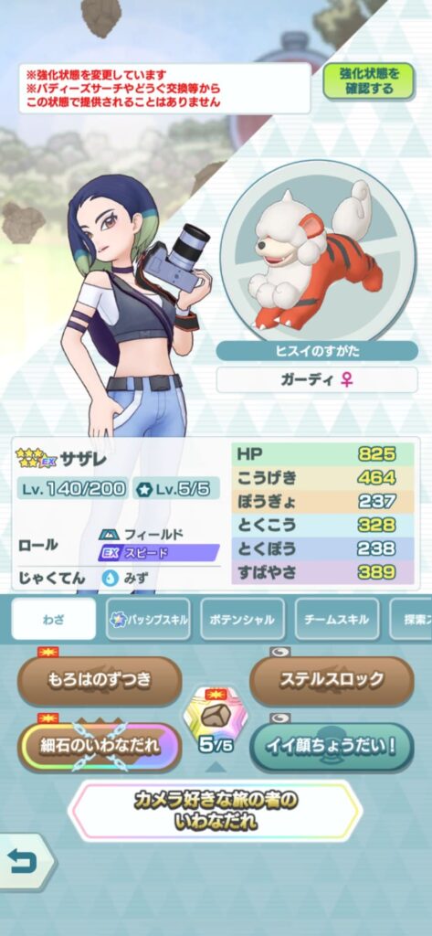 サザレ&ガーディは、パッシブスキル【パルデアの速攻】の効果により、初めて登場したときだけ自分のチームにパルデアのタグを持つ味方のバディーズが多いほどバディーズわざ発動可能状態までのカウントを減らせる、フィールドバディーズ。