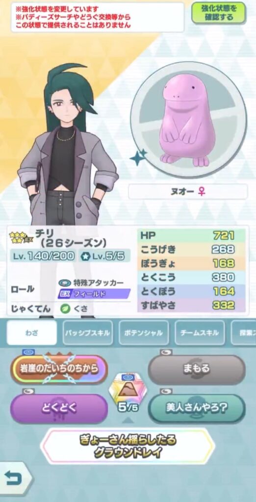 チリ(26シーズン)&ヌオーは、技【どくどく】で相手をどく状態にした際、パッシブスキル【ちぃと 揺れるで】の効果により、相手全員をどく状態にできるアタッカーバディーズ。