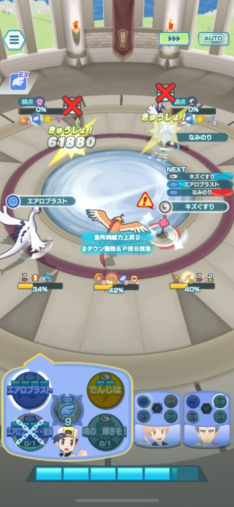 アオキ(スぺシャル)&カラミンゴが【バディーズわざ】を使用した後は、【エアロブラスト】を使用し、パッシブスキル【銀色に輝く魂】の効果でEXあおぞらゾーンを発生させ、以降は【エアロブラスト】で攻撃していきます。