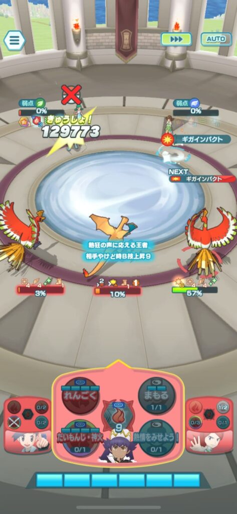 また、アルコスダンデ&リザードンの【バディーズわざ】後は、EXひざしがつよい状態の時間を有効に使い、アルコスダンデ&リザードンおよびヒビキ&ホウオウでダメージを稼ぐため、天気が消えるまで攻撃を控えました。