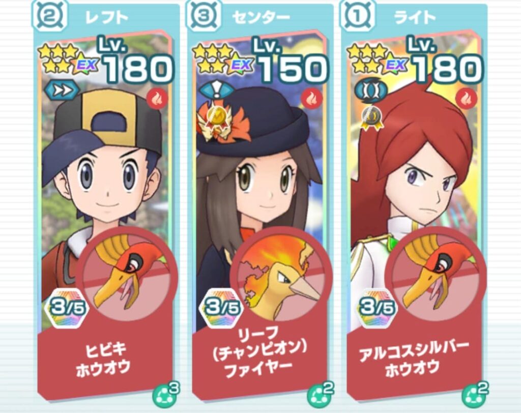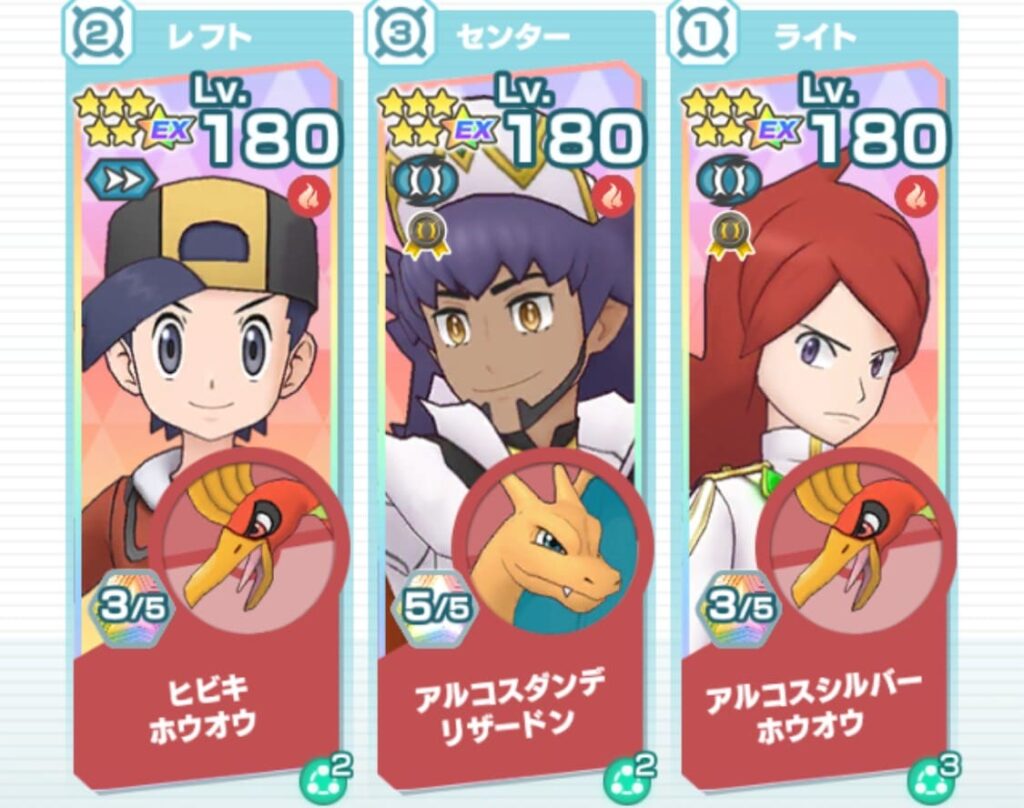 タンク性能が非常に高く、やけどダメージやヒビキ&ホウオウの【ほのおのうず】によるバインドダメージ、アルコスダンデ&リザードンの【キョダイゴクエン】による「ほのおダメージ場」の効果でダメージを稼ぎやすく、全体的に非常に強力でした。