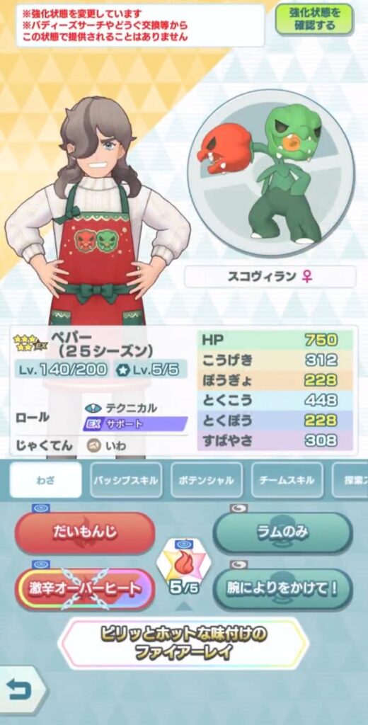 ペパー(25シーズン)&スコヴィランは、味方が【バディーズわざ】を使用した際に、パッシブスキル【食欲そそる激辛料理】の効果で【ラムのみ】の使用回数を1回減らし、バディーズわざ発動可能状態までのカウントを1つ減らせる、テクニカルバディーズ。