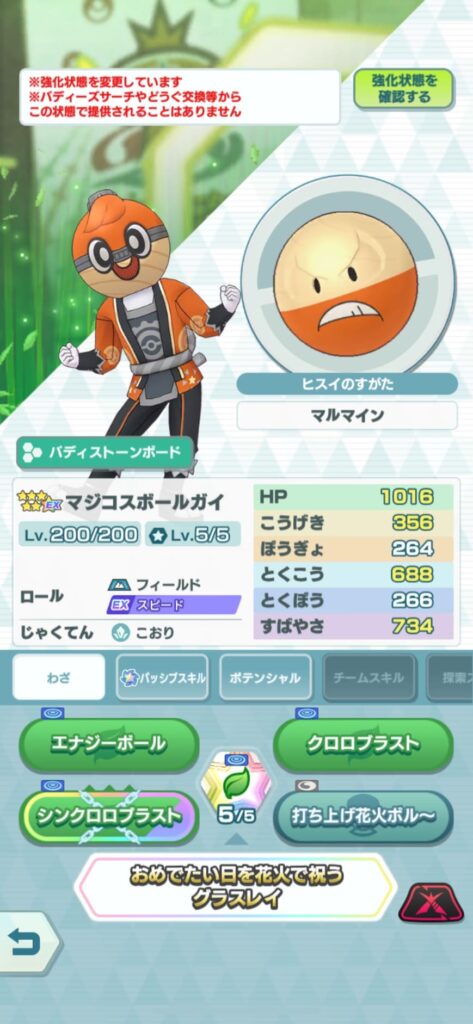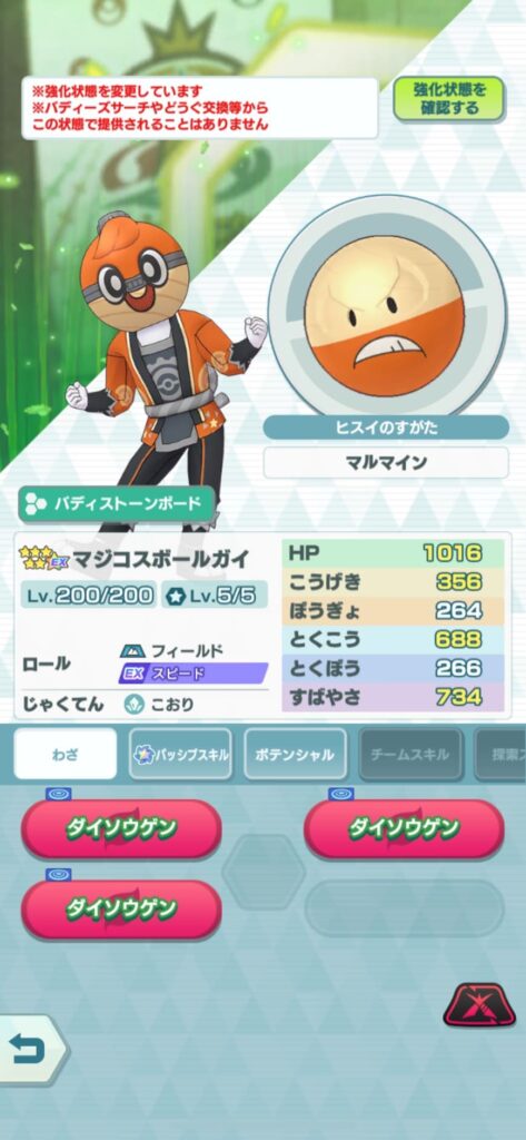 また、自身がひんしになる直前には、パッシブスキル【た~まや~!】の効果により、【だいばくはつ】を使用し、バディーズわざ発動可能状態までのカウントを9減らすことができます。