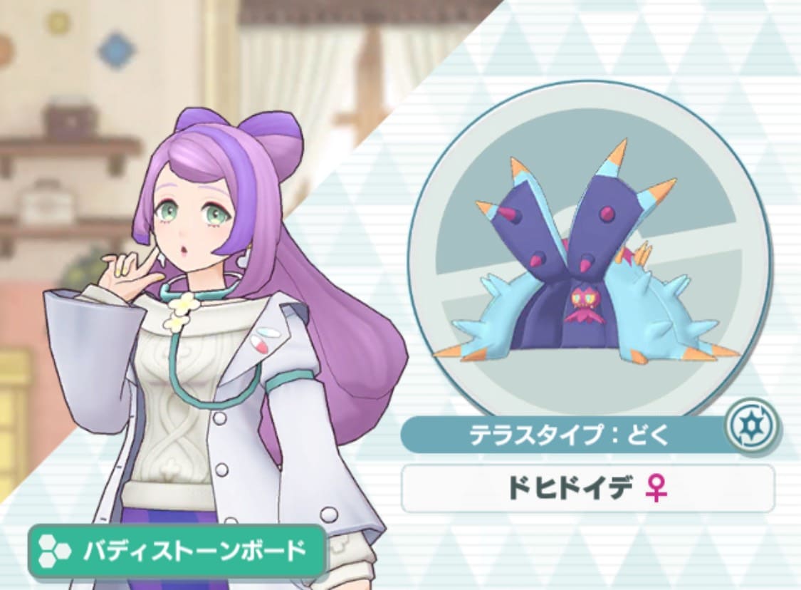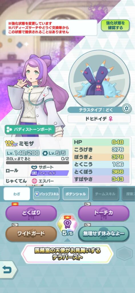 ミモザ&ドヒドイデは、パッシブスキル【パルデアの速攻】の効果により、初めて登場したときだけ自分のチームにパルデアのタグを持つ味方のバディーズが多いほどバディーズわざ発動可能状態までのカウントを減らせる、フィールドバディーズ。