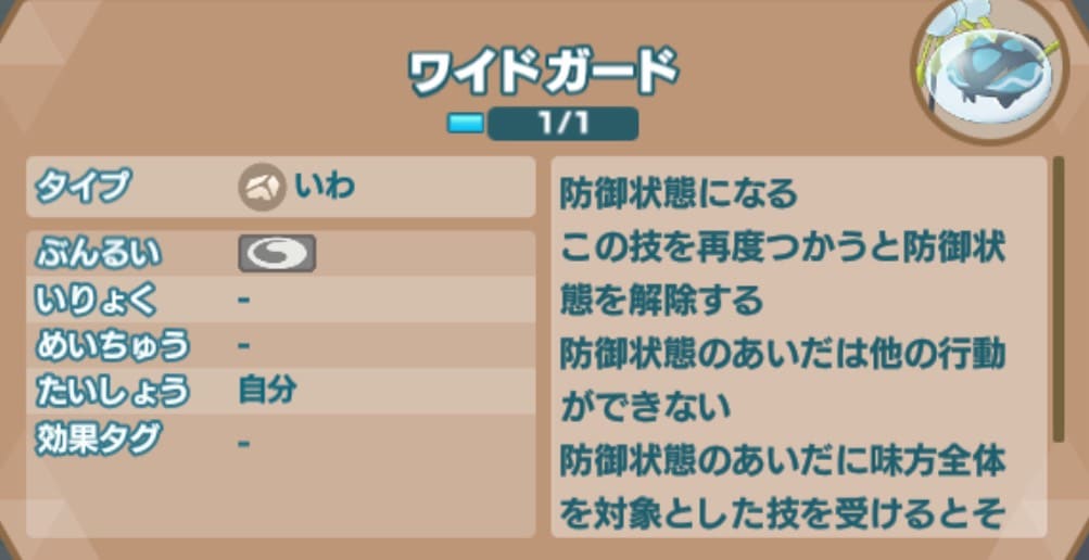 技【ワイドガード】は、使用すると防御状態になり、その間に技【じしん】や【ふぶき】などの味方全員を対象とする技を受けた場合、その技を無効化して防御状態を解除する技です。