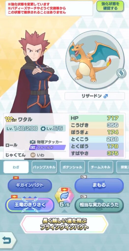 ワタル&リザードンは、パッシブスキル【竜の飛翔】の効果により、技【ギガインパクト】とシンクロ技【王竜のきりさく】はひこうタイプの技になっている、アタッカーバディーズ。