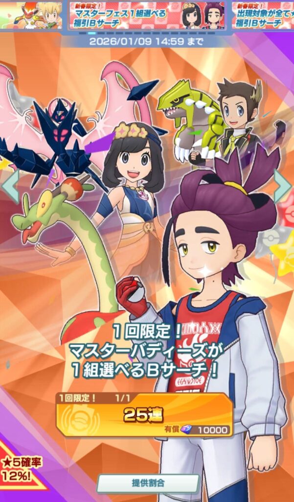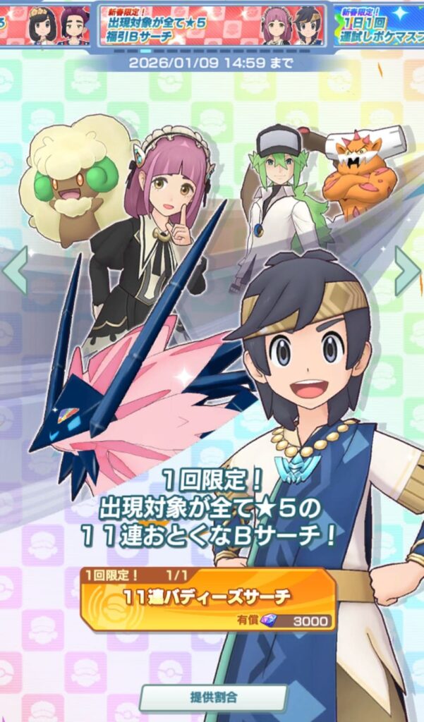 このサーチでは、★5ポケマスフェス限定バディーズが、各0.020%の確率で排出されます。