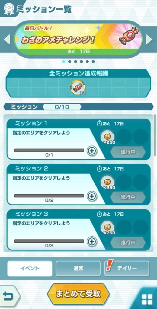 10日間クリアすることで、全ミッション達成報酬として、『わざのアメ(赤)★5』を獲得可能です。