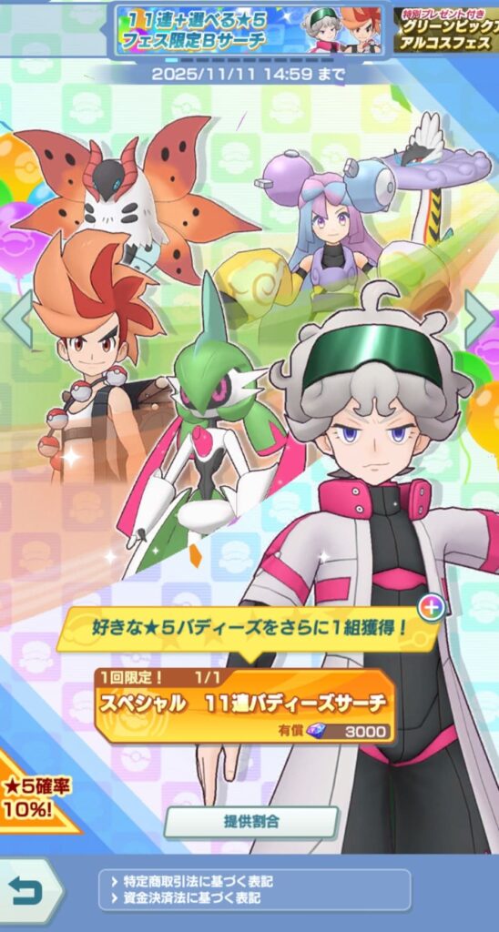 2025年11月02日15:00~11月11日14:59分までの間、スコアアタックイベントの開催に合わせて『11連+選べる★5フェス限定Bサーチ』が開催されます。