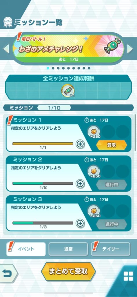 10日間クリアすることで、全ミッション達成報酬として、『わざのアメ(緑)★5』を獲得可能です。