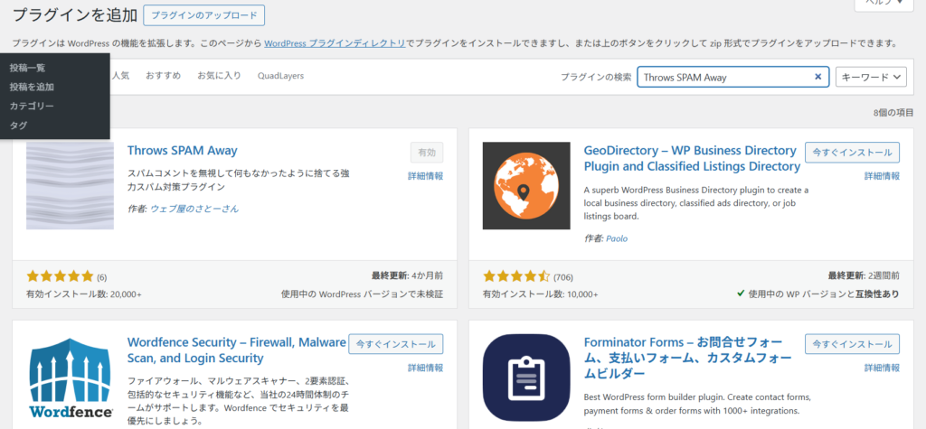 検索欄に 【Throws SPAM Away】 と入力すると、プラグインが表示されるので、