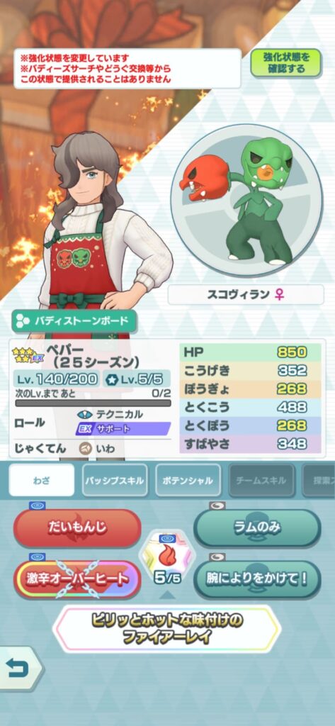 ペパー(25シーズン)&スコヴィランは、自チームが【バディーズわざ】を使用した際に、パッシブスキル【食欲そそる激辛料理】の効果で【ラムのみ】の使用回数を1回減らし、バディーズわざ発動可能状態までのカウントを1つ減らせる、テクニカルバディーズ。