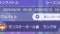 シーズンM-1 ランクマッチの報酬 開催期間 2026/04/08 09:00 ≀ 2026/05/13 10:59 使える特別な要素 メガシンカ 対戦の各種時間 総合時間:20分 持ち時間:7分 ...